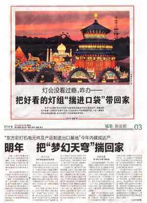 “東方彩燈制造出口基地”對(duì)產(chǎn)業(yè)的升級(jí)帶動(dòng)力還不止這些。自貢燈貿(mào)有限公司已經(jīng)先后在國(guó)內(nèi)200多個(gè)城市,國(guó)外30多個(gè)國(guó)家和城市進(jìn)行展覽展銷,境外觀展人次超過(guò)2000萬(wàn),其文化產(chǎn)品出口創(chuàng)匯名列全川前茅。“分析這么多年的外展外銷,我們發(fā)現(xiàn)了歐美市場(chǎng)在圣誕節(jié)期間的彩燈需求量巨大,因此基地將在這一塊上下功夫。”蔡翔透露,基地預(yù)計(jì)將在今年內(nèi)建成投產(chǎn),“希望將美輪美奐的自貢彩燈奉獻(xiàn)給世界這個(gè)大舞臺(tái)。”