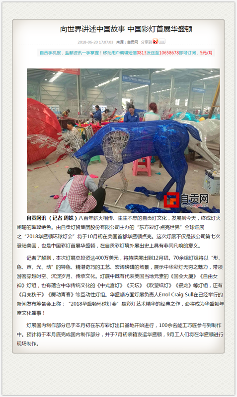 自貢燈貿(mào)集團股份有限公司主辦的“東方彩燈·點亮世界”全球巡展之“2018華盛頓環(huán)球燈會”即將于2018年10月-12月在Washington D.C隆重展出。本次燈展國內(nèi)制作燈組已于6月底完成裝箱啟運。