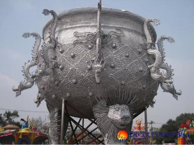 東方彩燈精心設(shè)計(jì)制作的“九龍鼎”燈組采用景德鎮(zhèn)青花玲瓏瓷具杯、羹、匙、盅、盤(pán)、碟、碗等近30萬(wàn)件手工捆扎而成,主體為鋼結(jié)構(gòu);鼎高和直徑均為18米,最大處直徑26米,總重近100噸。