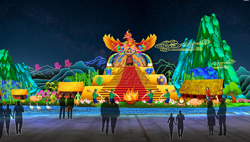 本屆太陽節(jié)以《太陽崇拜》、《玉米門神》等瑪雅諸神燈組,以及《夢幻森林》、《動(dòng)物世界》里與瑪雅人息息相關(guān)的動(dòng)物燈組,與《古蜀文明》、《古蜀生活》中古蜀人漁獵農(nóng)耕和祭祀相關(guān)的燈組交相輝映。園區(qū)氛圍營造也極具特色,瑪雅象形文字、古蜀紋飾等元素將帶領(lǐng)觀眾進(jìn)入兩大文明交匯的海洋。當(dāng)然,應(yīng)景的“年味兒”也必不可少,東方彩燈打造金沙節(jié)史上最大的立體生肖豬造型,向觀眾送上新年祝福。