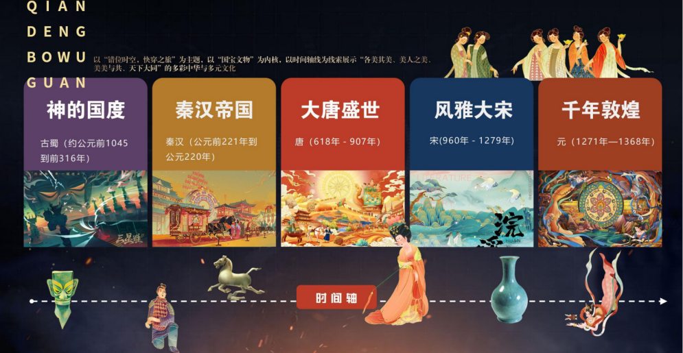 自貢燈貿(mào)集團(tuán)承制的第29屆自貢國際恐龍燈會(huì)《千燈博物館》燈組以“錯(cuò)位時(shí)空,快穿之旅”為主題,以“國寶文物”為內(nèi)核,以時(shí)間軸為線索展示“各美其美、美人之美、美美與共、天下大同”的多彩中華與多元文化。用故事化、場景式的方式讓游客體驗(yàn)文物背后的文化,仿佛身臨文物當(dāng)年的時(shí)代。