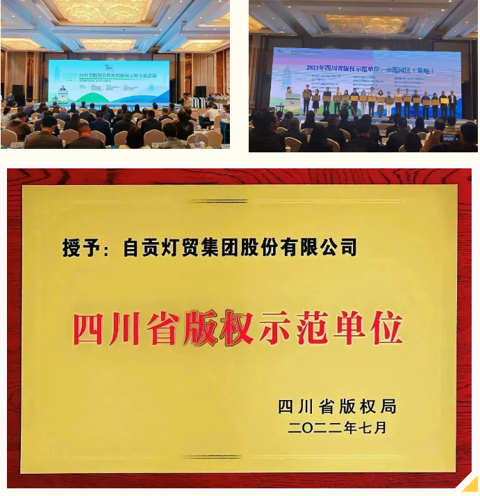 在第23個世界知識產(chǎn)權(quán)日來臨之際,由中國版權(quán)協(xié)會、四川省委宣傳部版權(quán)局主辦,綿陽市委宣傳部承辦的“四川省2023版權(quán)宣傳周暨版權(quán)示范交流活動”于2023年4月25日在綿陽舉行,活動以“推動版權(quán)創(chuàng)新創(chuàng)造 助力文化自信自強”為主題,以線上線下聯(lián)動方式同步推出。活動當天,省版權(quán)局為2021至2022國家級、省級版權(quán)示范單位和示范園區(qū)(基地)授牌。自貢燈貿(mào)集團股份有限公司參加了活動,并獲頒“四川省版權(quán)示范單位”榮譽稱號。