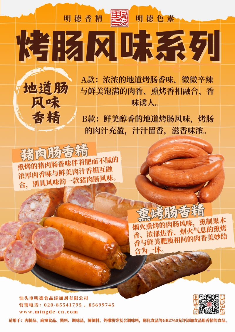 明德烤腸風味系列香精 煙熏肉香 層次真實汕頭市明德食品添加劑有限公司推出的烤腸風味系列香精,覆蓋地道腸風味香精、豬肉腸香精、熏烤腸香精等多種調性。產品風味真實、留香穩(wěn)定,適用于肉制品、復合調味、腌制與外撒粉等B端工廠,幫助快速打造具有記憶點的烤腸類風味。
